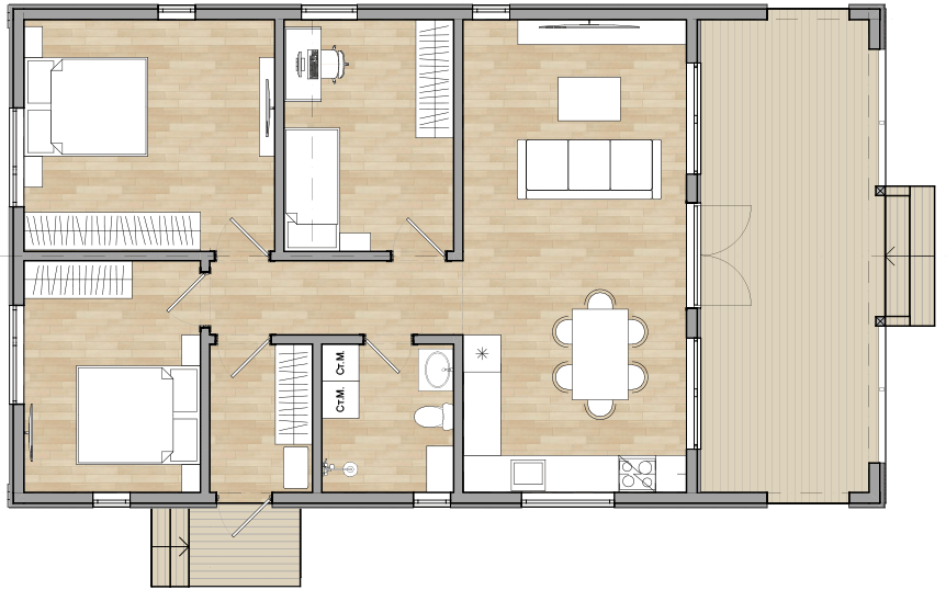 Одноэтажный дом с большой гостиной, крытой террасой и большой мастер-спальней.