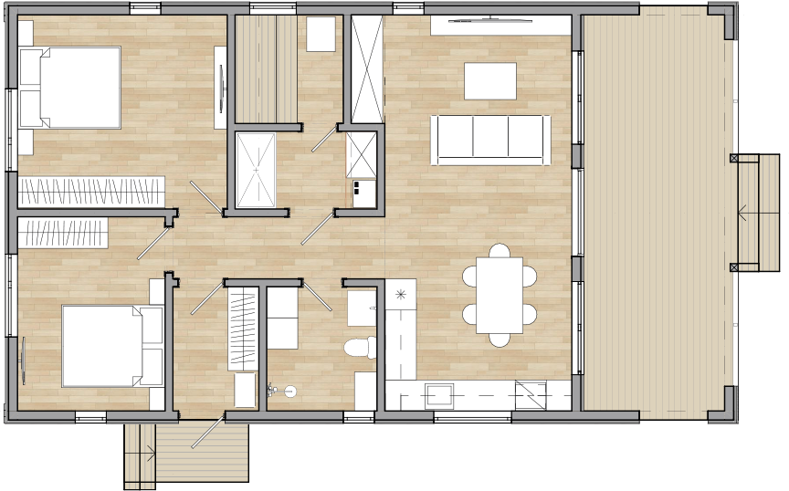 Одноэтажный дом с большой гостиной, крытой террасой и большой мастер-спальней.