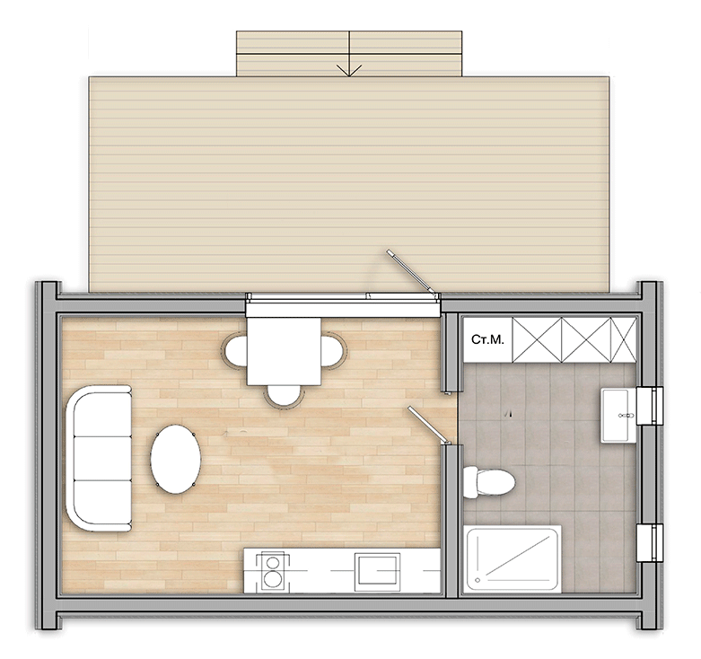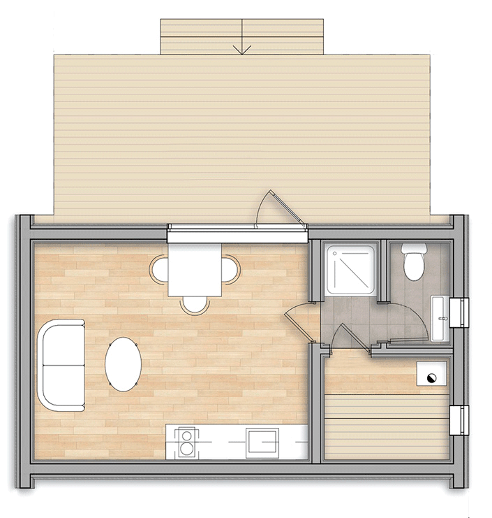 Компактный одноэтажный дом с открытой террасой. Доступно в конфигурации гостевого дома или бани.